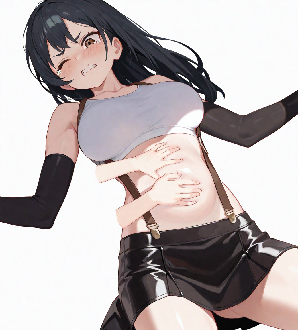 両手でお腹を強く押さえたまま身体を震わせ痛みに耐えるような仕草を見せるソフィア。